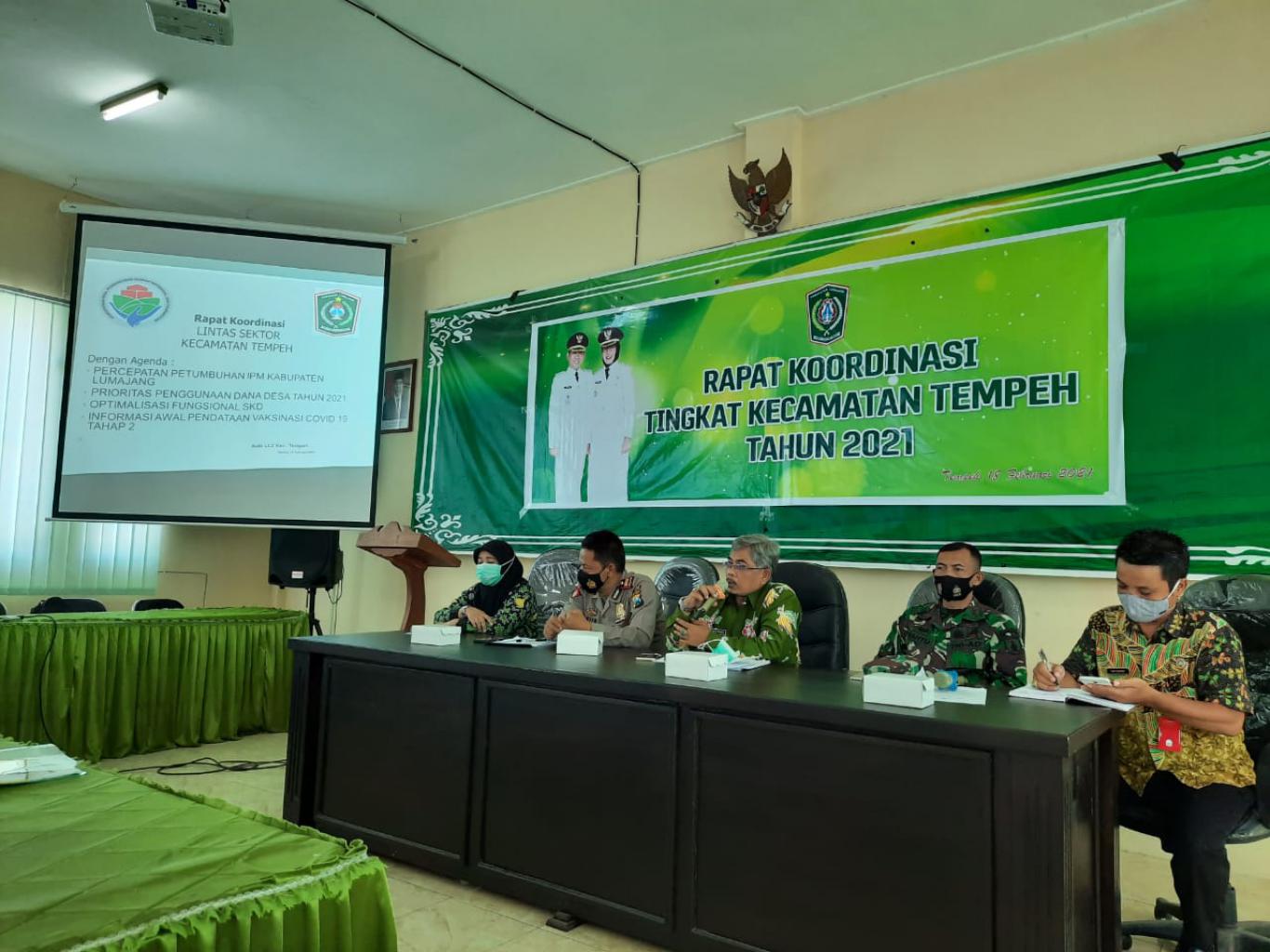Demi menyamakan persepsi listas sektor dalam membangun Kecamatan Tempeh. Kecamatan Tempeh mengadakan rapat koordinasi tingkat Kecamatan Tempeh di Aula Kantor Kecamatan Tempeh, Kamis (18/02/21). Agenda pada Rakor ini membahas berbagai permasalahan dan program strategis dari Kabupaten Lumajang, diantaranya Percepatan Pertumbuhan IPM (Indeks Pembangunan Manusia), Prioritas Penggunaan Dana Desa 2021, Optimalisasi SKD (Satgas Keamanan Desa), Persiapan Musrenbang Kecamatan.